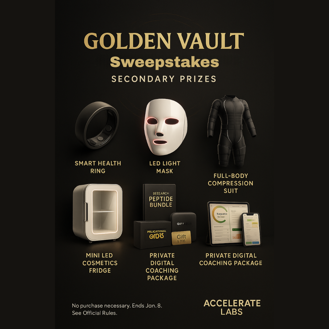 For a winners list, email support@accelerate-labs.us with subject “Golden Vault Winners List” after January 31, 2026 and before March 31, 2026.