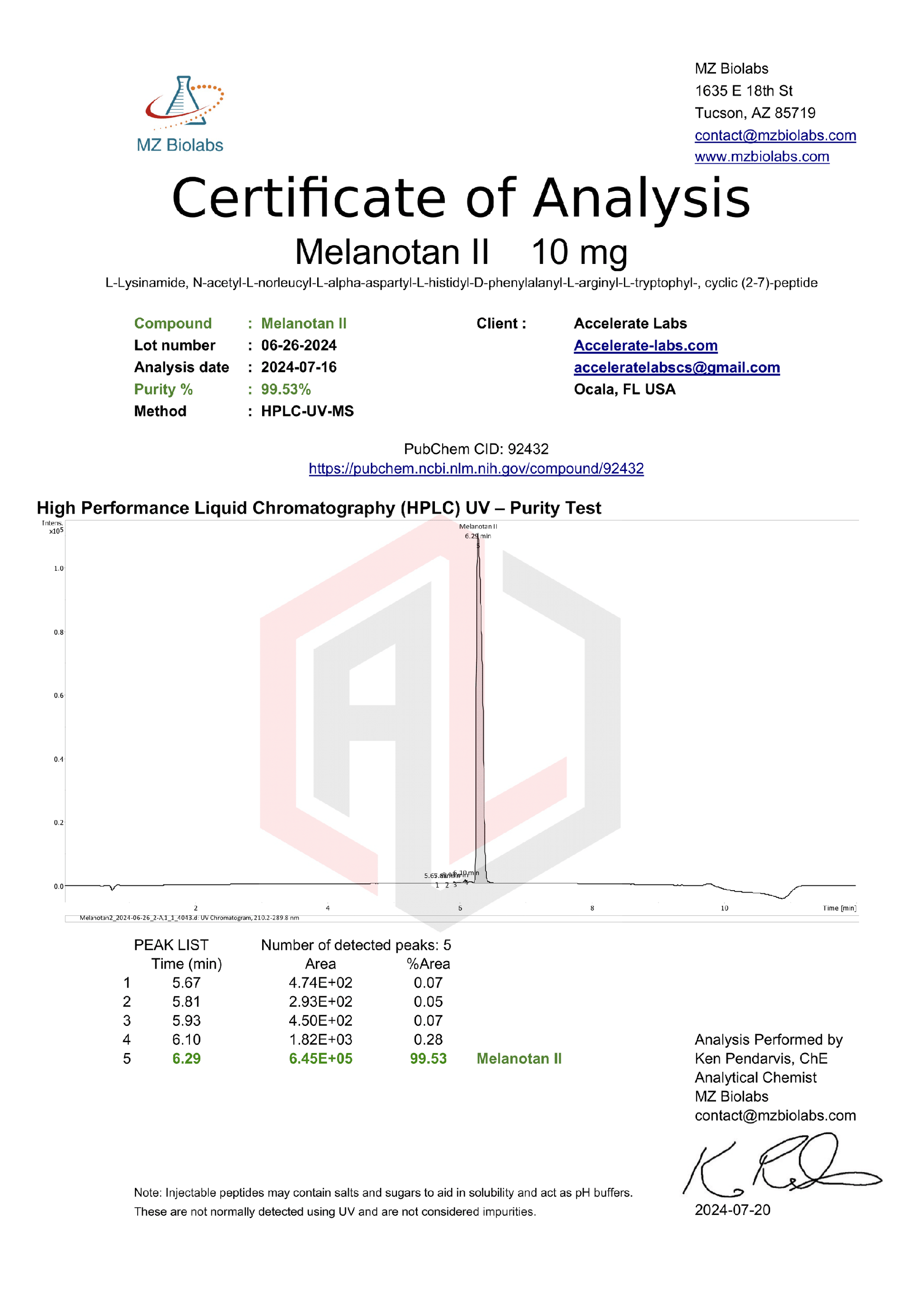 At Accelerate Labs, we take the integrity of our research peptides seriously. That’s why every batch undergoes rigorous 3rd party testing in the USA to ensure the highest standards of purity and quality before they are made available for purchase. We've partnered with MZ Biolabs, a trusted, DEA schedule III licensed facility, to handle our Certificates of Analysis (COAs) and verify that each product meets the specifications required for research.